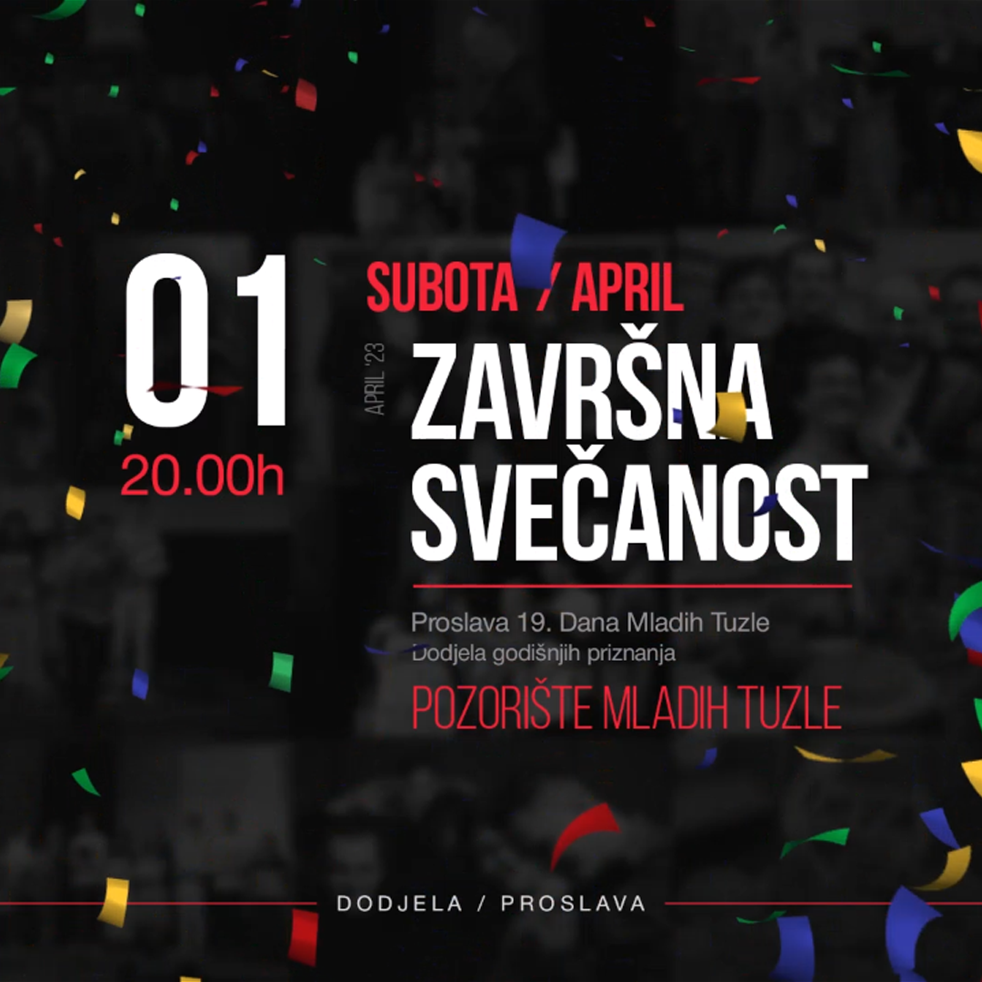 Završna svečanost – Proslava 19. Dana Mladih Tuzle Završna svečanost proslave je planirana u subotu, 1.4.2023. godine u Pozorištu