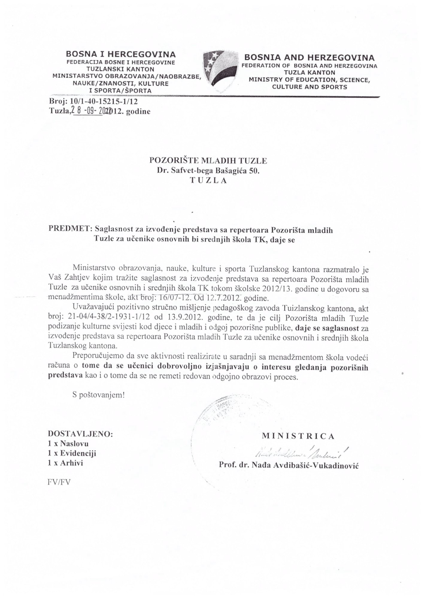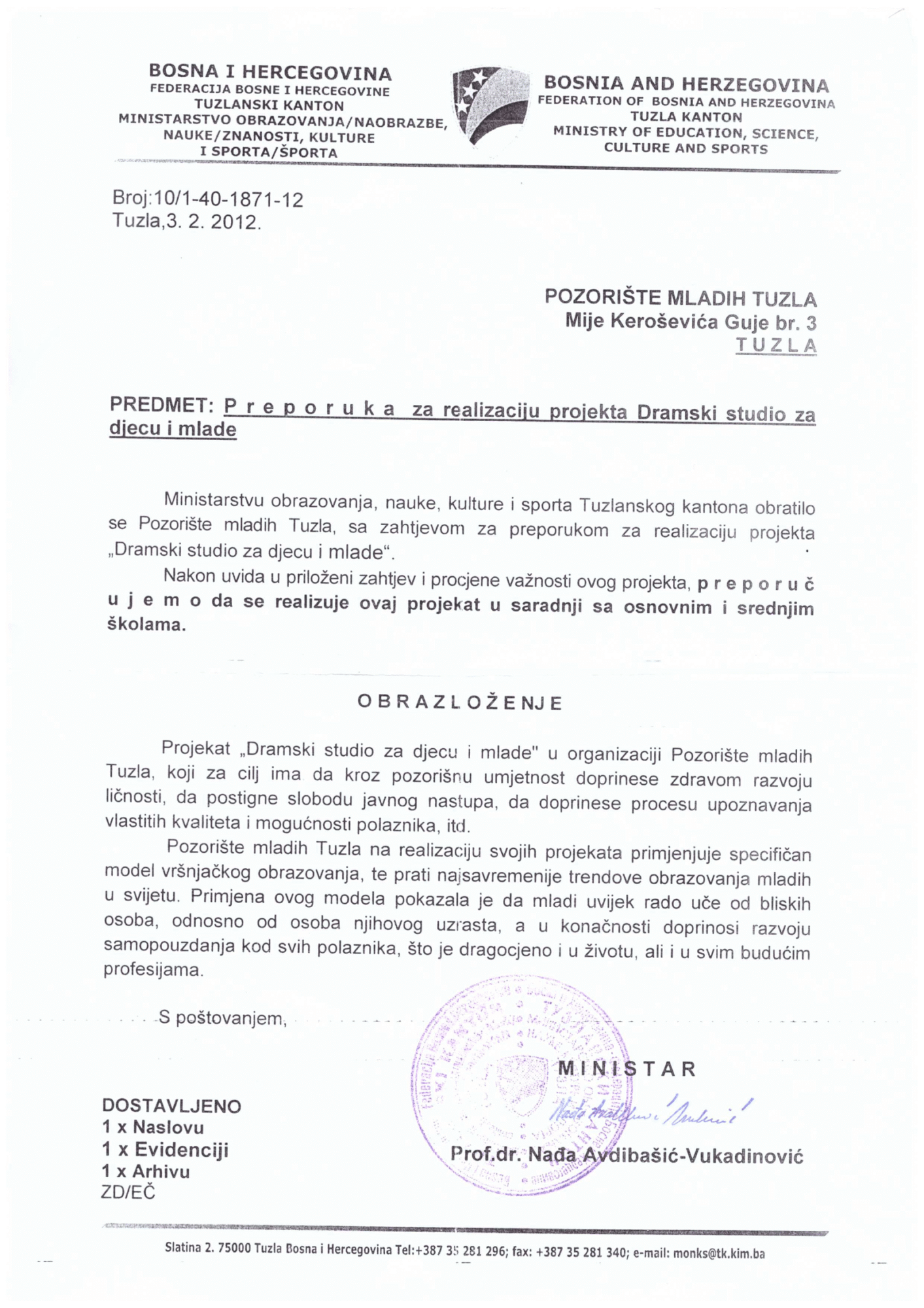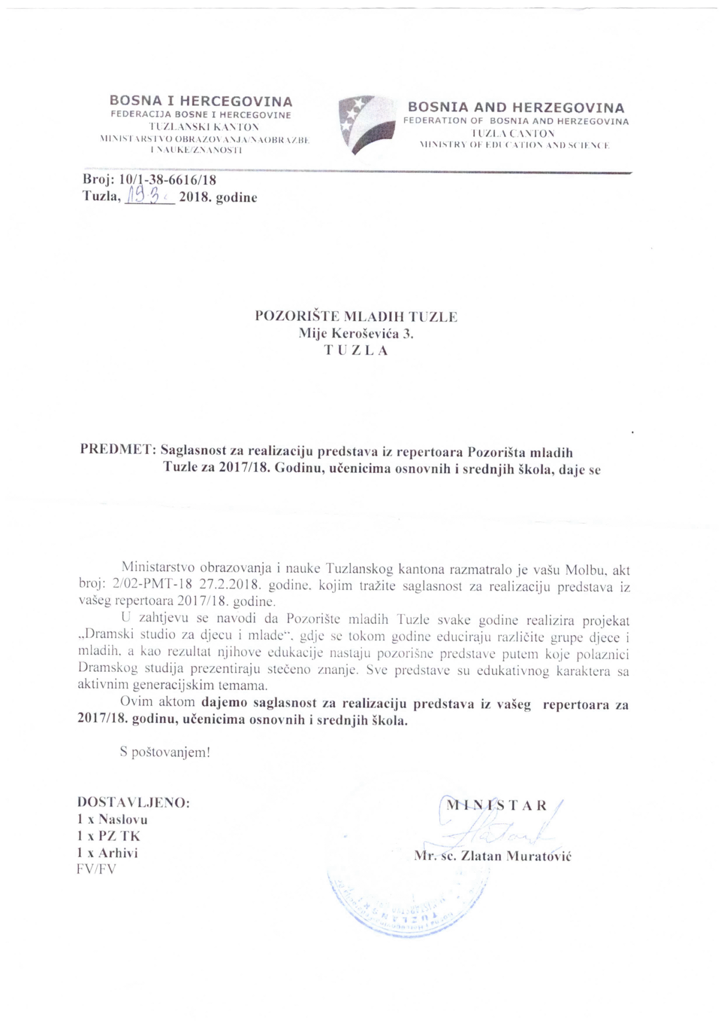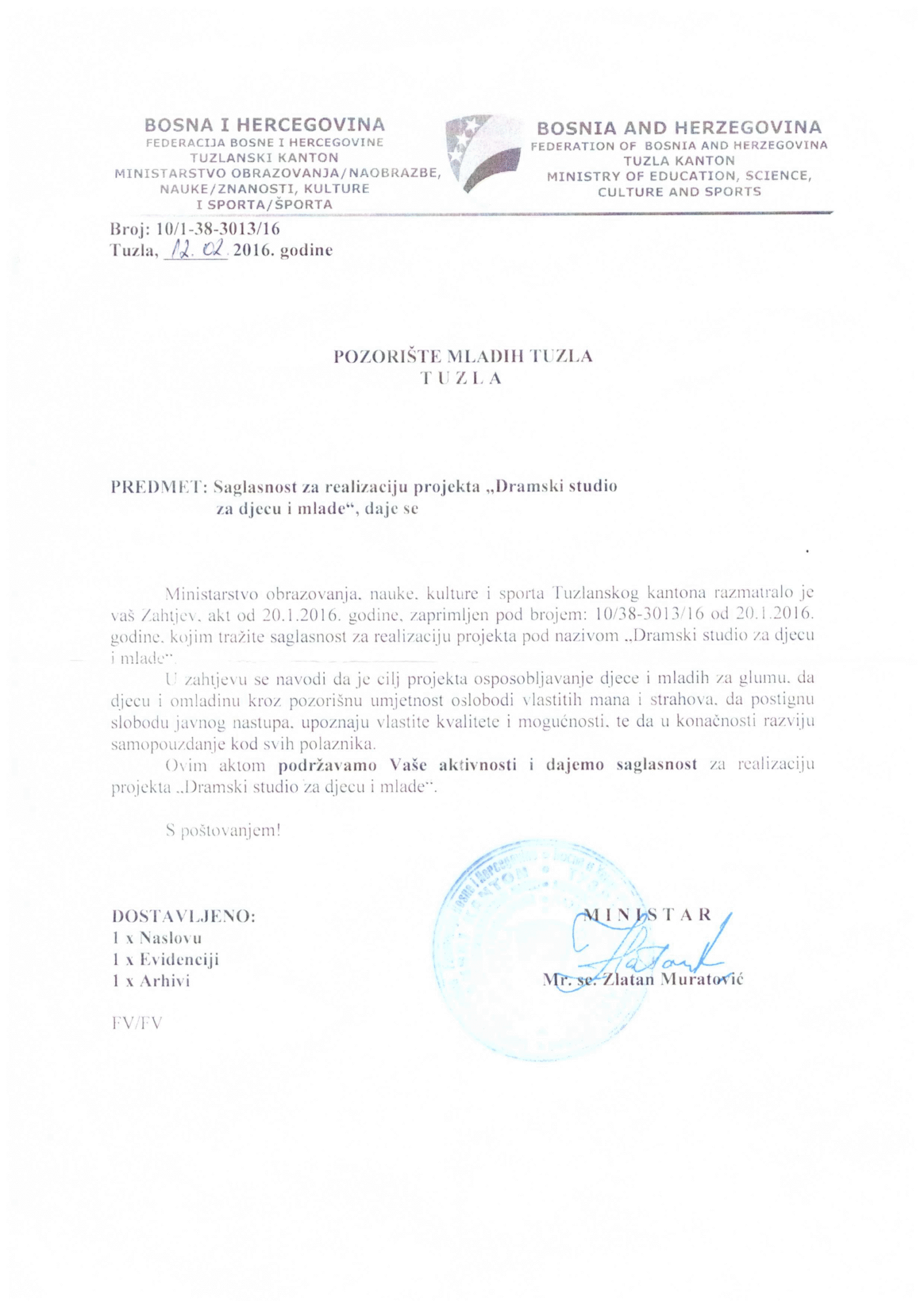 - Saglasnost za rad od Pedagoškog zavoda TK i Ministarstva obrazovanja i nauke TK