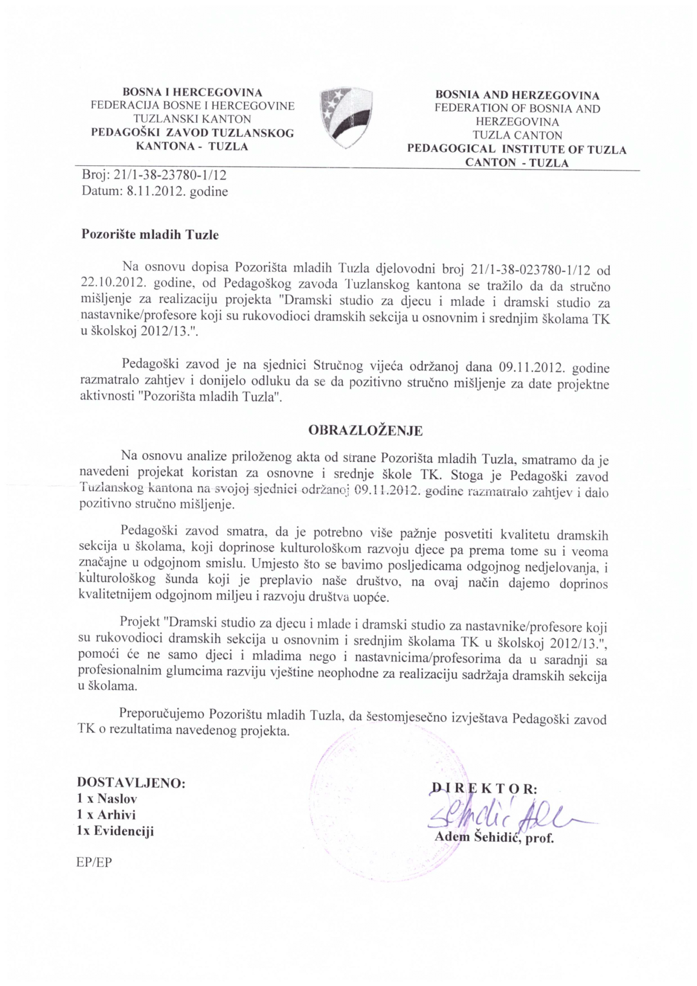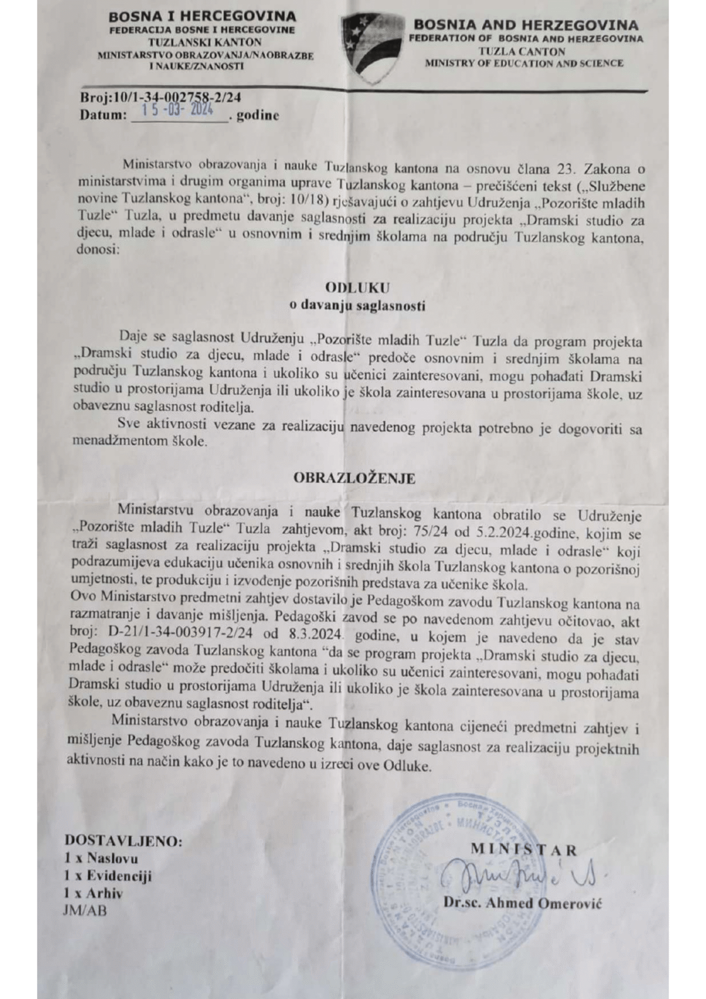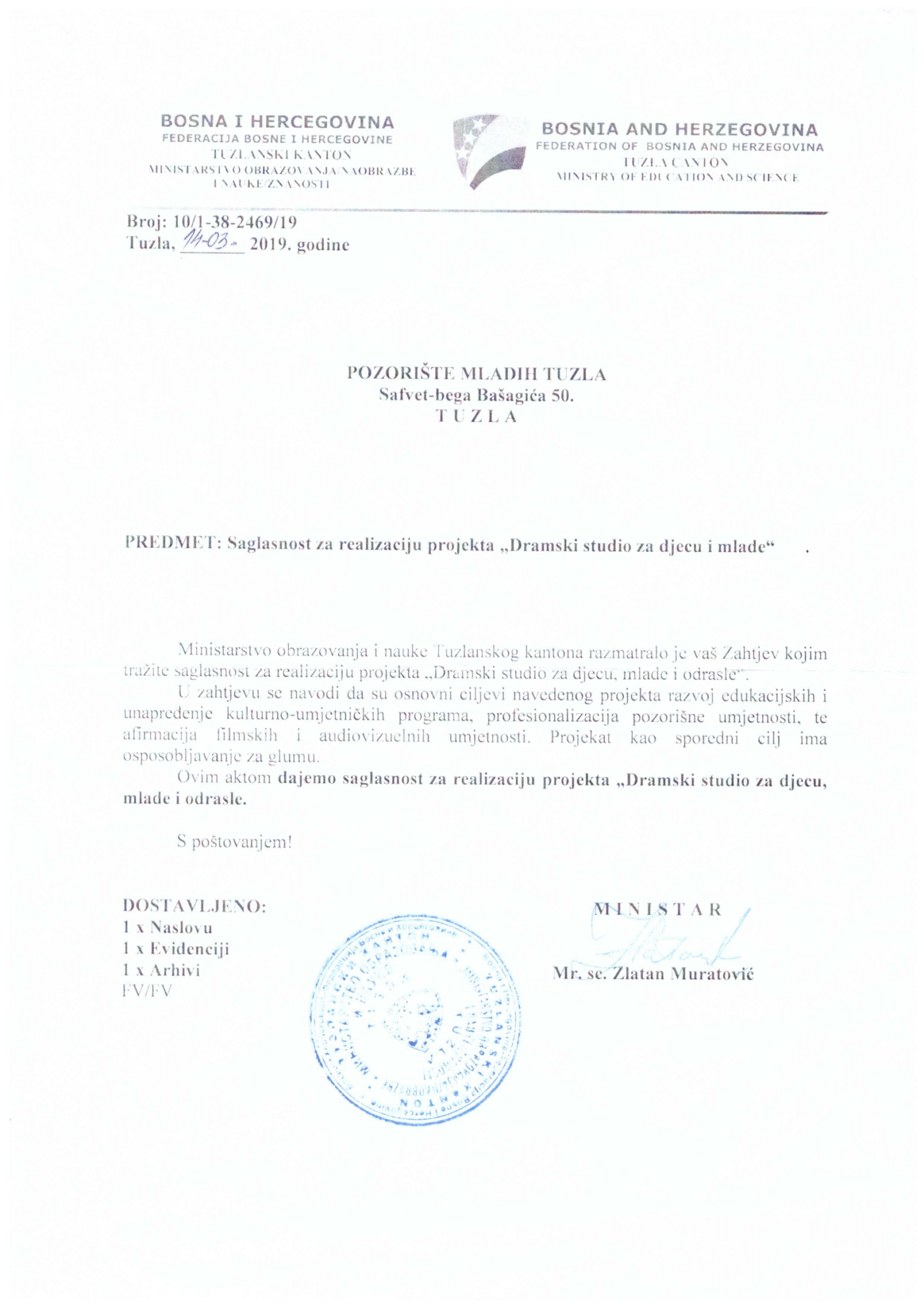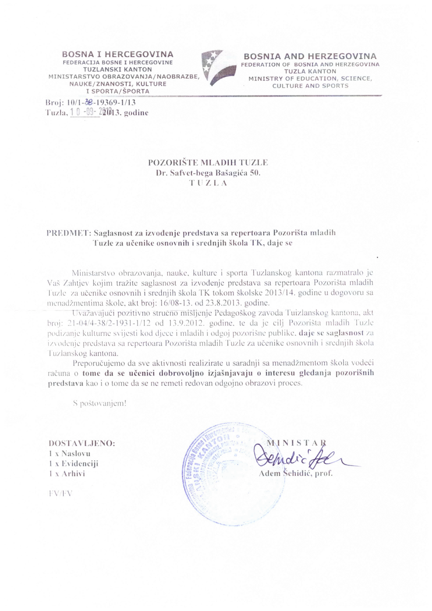 - Saglasnost za rad od Pedagoškog zavoda TK i Ministarstva obrazovanja i nauke TK