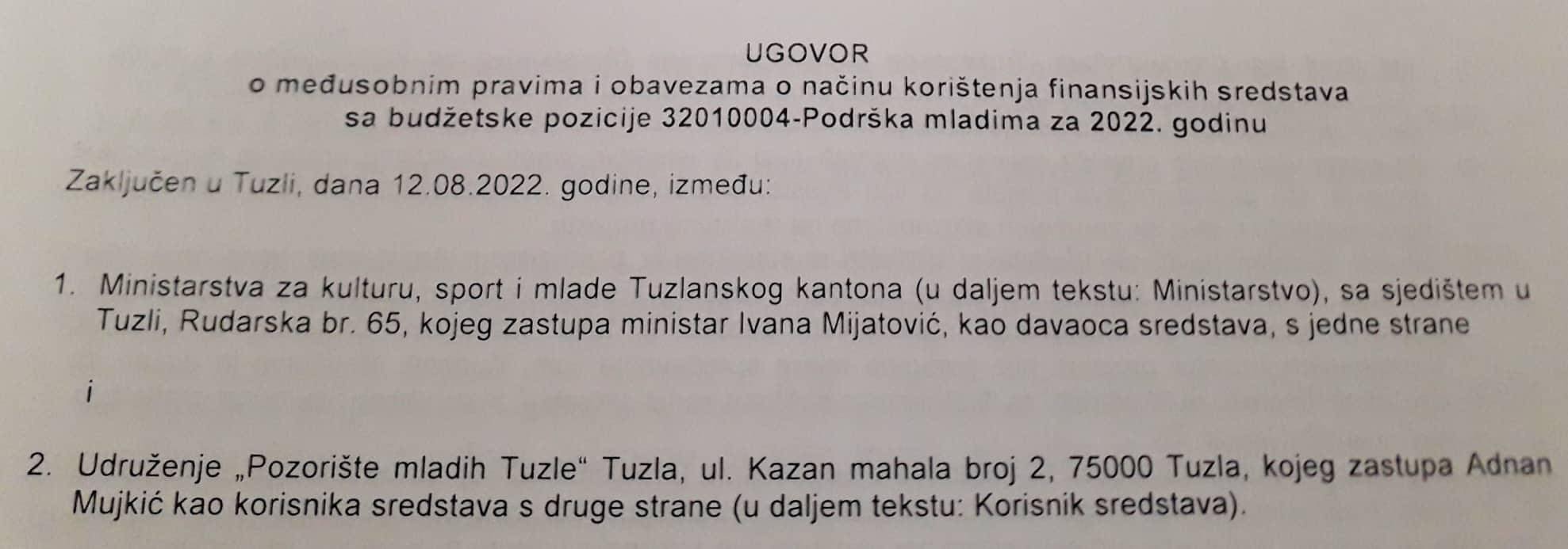 U prostorijama Ministarstva za kulturu, sport i mlade Tuzlanskog kantona između Pozorišta mladih Tuzle i Ministarstva za kulturu, sport i mlade TK potpisan je Ugovor o međusobnim pravima i obavezama i načinu korištenja finansijskih sredstava sa budžetske pozicije 32010004 – Podrška mladima za 2022. godinu.
