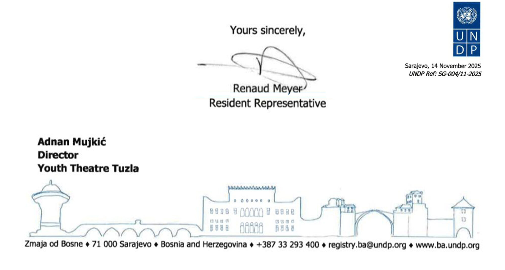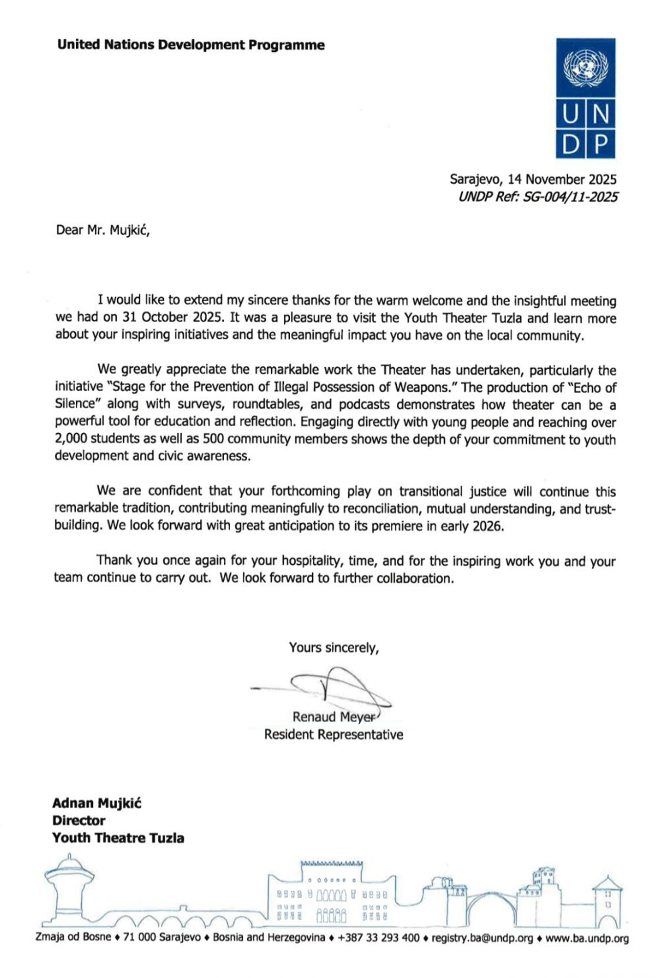 Na adresu Pozorišta mladih Tuzle je u utorak, 18. novembra 2025. godine stiglo pismo zahvale od gospodina Renaud Meyer UNDP rezidentnog predstavnika UNDP Bosnia and Herzegovina koji nas je, zajedno sa svojim saradnicama i saradnicima, nedavno posjetio.